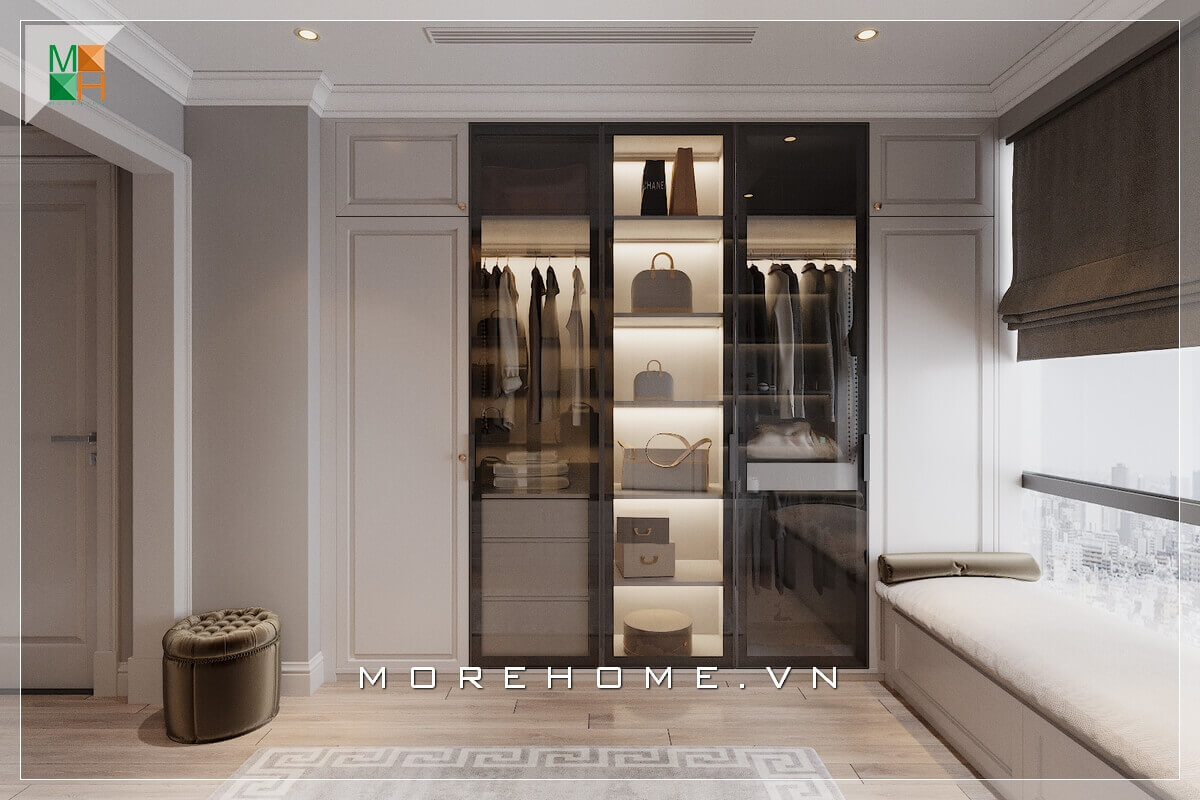 Phòng thay đồ ấn tượng với đảo phụ kiện thiết kế dạng quầy bar đặt giữa không gian căn phòng biến không gian nơi đây trở nên đẹp lạ hiện đại và tiện nghi.