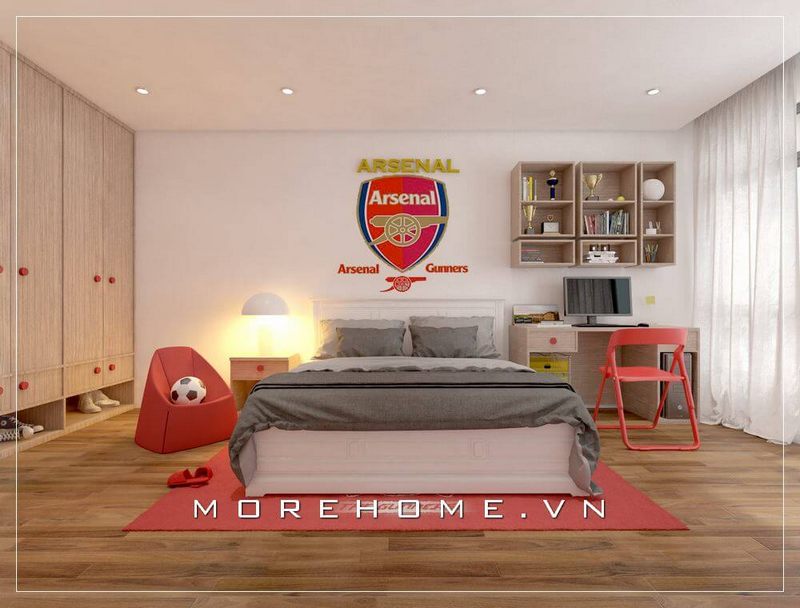 Mẫu giường ngủ gỗ bệt phòng bé trai bằng gỗ công nghiệp phong cách hiện đại có tab đầu giường đơn giản và tiện nghi