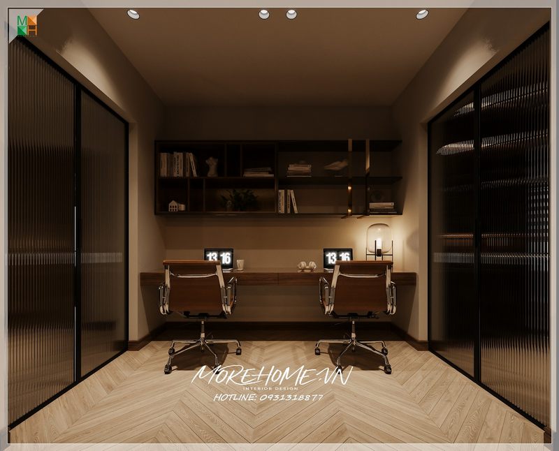 Ở phía trước là một kệ tủ cao lớn, nó được sử dụng để trưng bày sách vở và trang trí, góp phần tạo nên hiệu quả đẹp mắt.