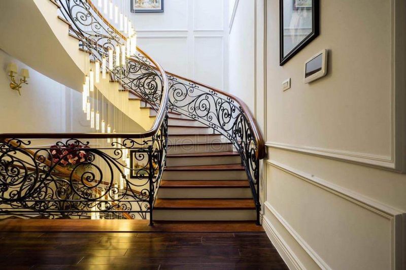 Không gian biệt thự tân cổ điển được trang trí rất tinh tế bằng các phào chỉ, tranh treo tường và đèn chùm.