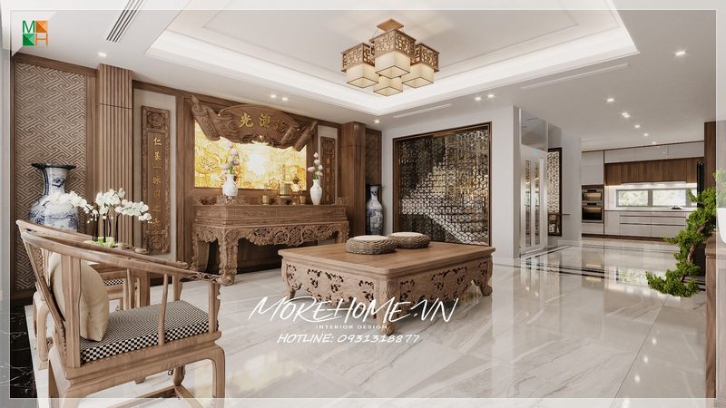 Không gian thiêng liêng và ấm áp nhất trong căn nhà là nơi thờ cúng tổ tiên, được trang trí bằng gỗ óc chó sang trọng và hiện đại.